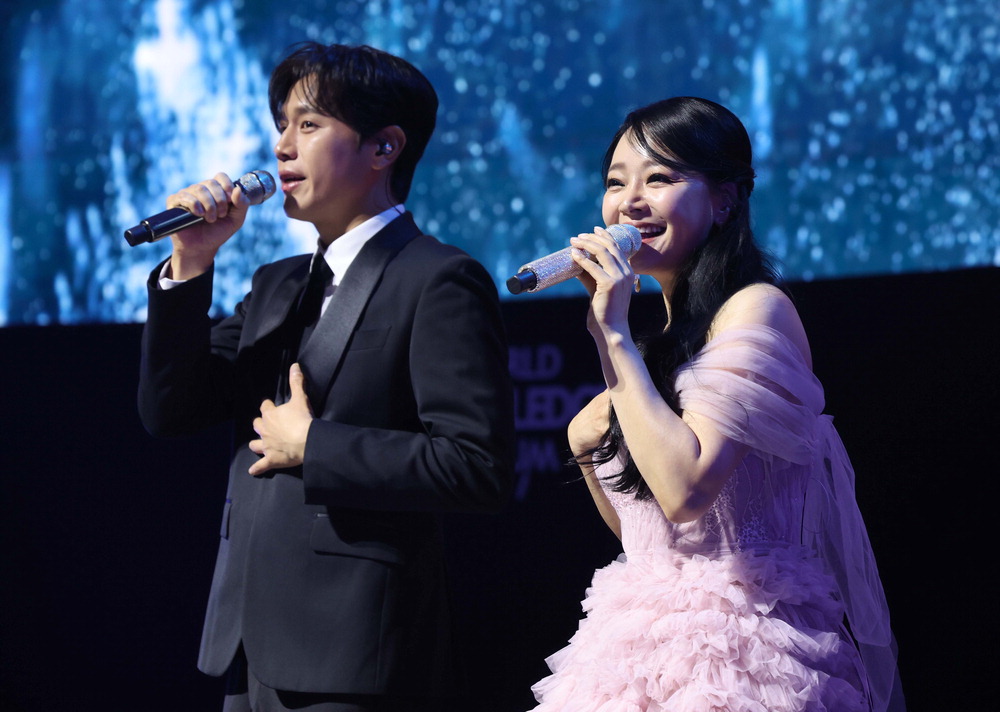 지난 10일 저녁 서울 중구 장충아레나에서 진행된 제26회 세계지식포럼 갈라 만찬 축하 공연 무대에 오른 뮤지컬 배우 김소현·손준호 부부는 공연에 앞서 이같이 말했다. 이날 김소현 씨는 연한 장밋빛 드레스를,손준호 씨는 모델핏의 슈트를 입고 장충아레나를 가득 채우는 성량을 뽐냈다. 두 사람은 노래 중간중간 사랑스러운 눈빛으로 서로를 바라보고 함께 춤을 추는 등 관객들의 시선을 사로잡았다.