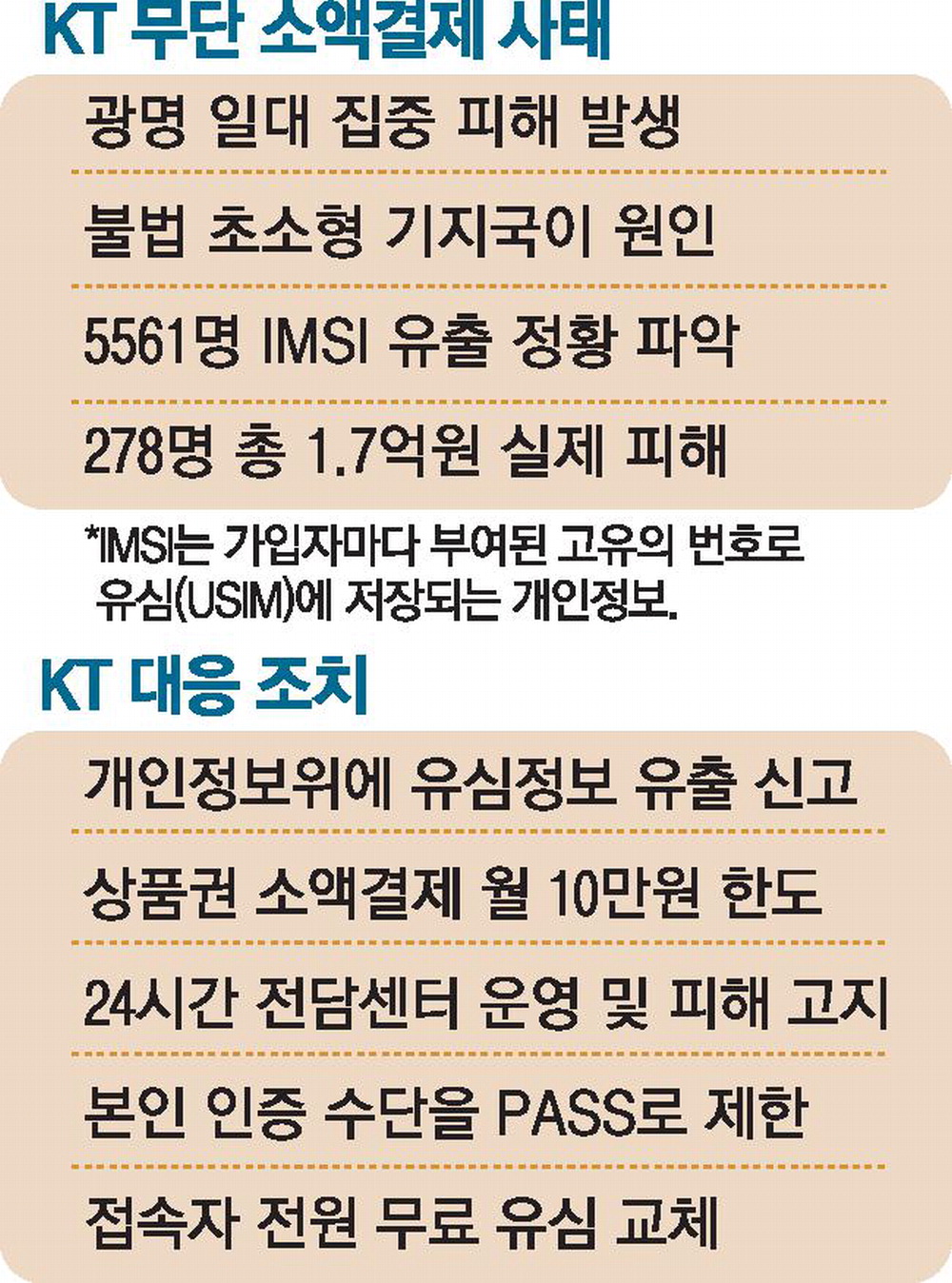 KT는 11일 서울 종로구 광화문 사옥에서 기자간담회를 열고 "불법 초소형 기지국(펨토셀)의 비정상 접속으로 일부 고객의 가입자식별번호(IMSI)가 유출됐을 가능성이 있다"고 밝혔다. IMSI는 휴대전화 단말이 네트워크에 접속할 때 제시하는 고유 번호로 유심에 저장되는 개인정보다. 주민등록번호처럼 단말기마다 고유하게 부여되지만 직접 소액결제를 실행하려면 유심 인증키(Ki)가 함께 필요하다. KT 자체 조사 결과,이번에 불법 기지국 신호를 수신한 가입자는 총 1만9000명에 달했다. 이 가운데 5561명은 IMSI가 외부로 유출됐을 가능성이 있는 것으로 파악됐다. KT는 이날 오후 개인정보보호위원회에 관련 사실을 신고하고,해당 가입자들에게 피해 여부 조회와 무료 유심 교체,보호 서비스 가입이 가능한 문자메시지를 발송했다. 김 대표는 이날 "최근 소액결제 피해 사고로 큰 불안과 심려를 끼쳐드려 죄송하다"며 "관계당국과 함께 원인을 철저히 규명하고 모든 역량을 투입해 추가 피해를 막겠다. 피해 고객들께는 100% 보상책을 마련하겠다"고 말했다.