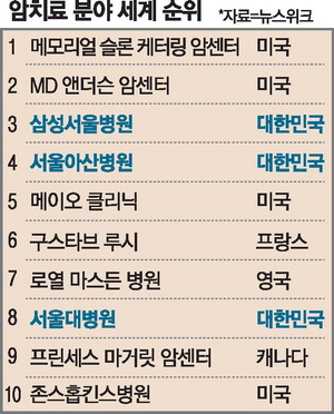 국내 주요 병원들이 세계 암 치료 분야에서 다시 한번 경쟁력을 입증했다. 미국 시사주간지 뉴스위크가 글로벌 조사기관 슈타티스타와 실시한 평가에서 삼성서울병원과 서울아산병원,서울대병원 3곳이 상위 10위권에 나란히 이름을 올린 것이다. 이는 3년 연속 이어진 성과로,한국 의료가 미국 중심의 암 치료 판도에서 입지를 한층 더 공고히 했다는 분석이 나온다.