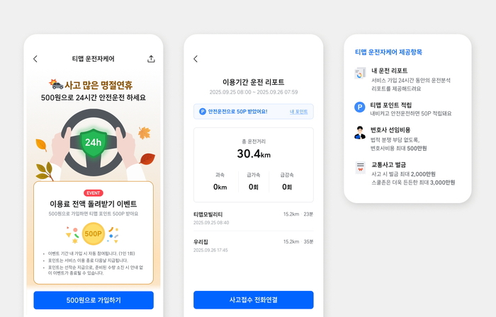 티맵 ‘운전자케어’. <티맵모빌리티> 티맵모빌리티는 500원으로 24시간 동안 주행분석 서비스와 벌금 지원 등 혜택을 받을 수 있는 ‘티맵 운전자케어’ 서비스를 출시했다고 25일 밝혔다.