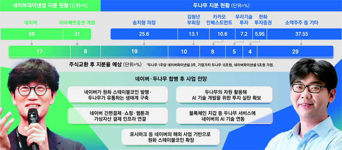 두 회사의 지분 교환이 현실화할 경우 두나무는 네이버라는 탄탄한 파트너를 통해 미래 금융 사업을 본격적으로 펼칠 수 있게 된다. 네이버파이낸셜이 스테이블코인을 발행하면 두나무는 이를 자체 블록체인 ‘기와’를 통해 유통할 수 있다. 또한 업비트에 상장해 국내외 유동성을 제공하고 손쉽게 다른 가상자산이나 법정통화와 교환되도록 할 수 있다.