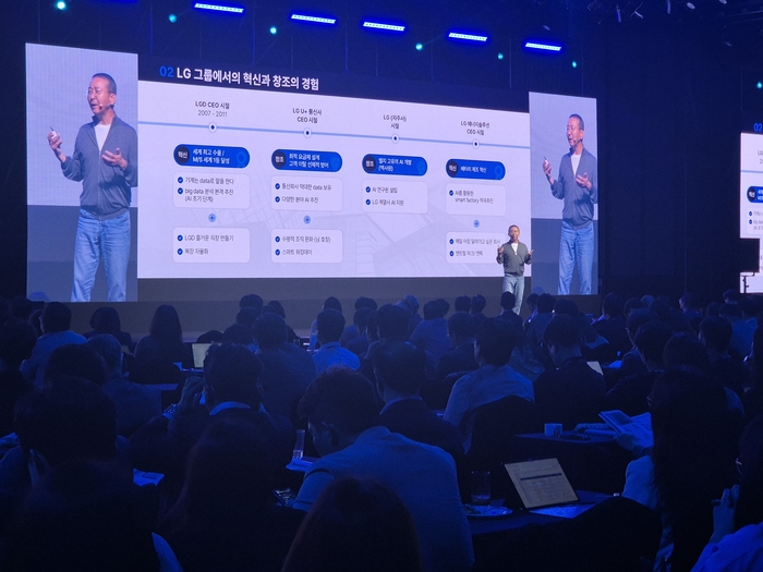 30일 낸 사업 전략 수립을 고민하는 최고경영자(CEO)를 위해 ‘포사이트 코리아(휴넷CEO 포럼)’에서 권영수 전 LG에너지솔루션 CEO(부회장)·고문이 기조연설을 하고 있다. [사진 출처 = 최종일 기자] “애플이라는 회사를 20년 동안 지켜봤지만,크게 바뀐 게 없는데도 태블릿과 스마트워치가 등장했다. 큰 창조가 아니더라도 혁신을 통해 큰 변화(혁신)를 이룬 것이다. ”