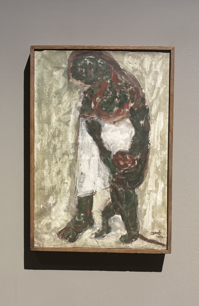 한묵의 ‘모자’(1954). <정유정 기자> 이들의 화폭에는 전쟁의 비극과 함께 다시 살아가려는 의지가 공존한다. 한묵의 ‘모자’는 다리를 잃은엄마를 아이가 지탱하는 모습을 그렸다. 박고석 ‘범일동 풍경’은 부산 범일동 철길을 따라 걸어가는 피난민의 모습을 담담히 묘사했다.