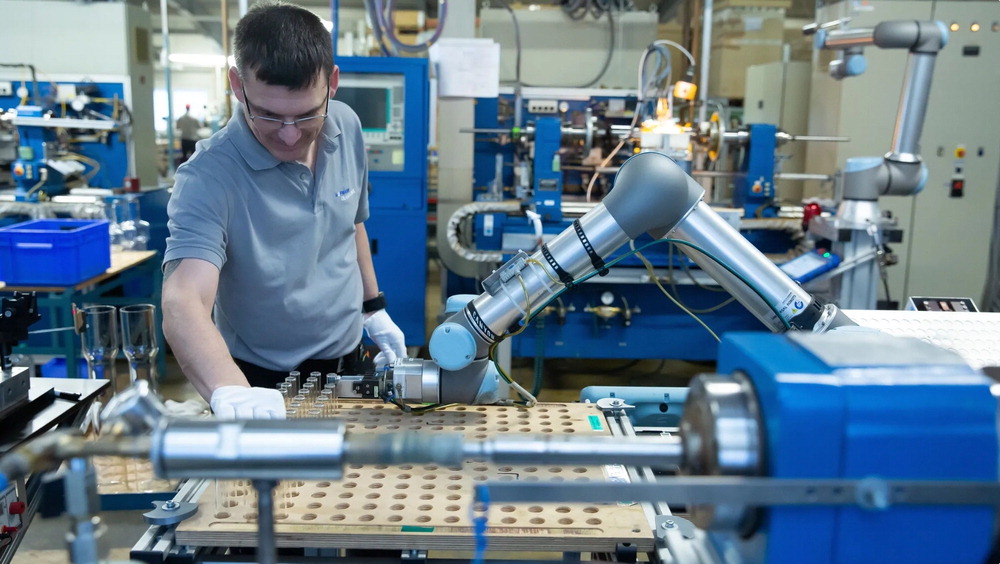 덴마크 유니버설로봇(UR) 제품인 협동로봇으로 작업하는 근로자. 유니버설로봇