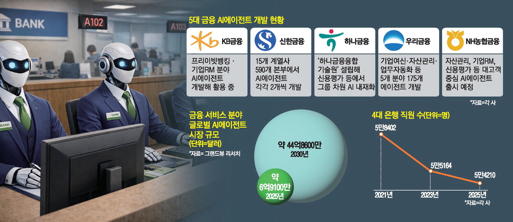 한편 금융사가 AI를 업무 전반에 내재화하면서 실제 은행원 수는 줄고 있다. 4대 시중은행 임직원 수는 2023년 말 5만5164명에서 지난해 말 5만4210명으로 연간 약 1000명씩 줄고 있다.