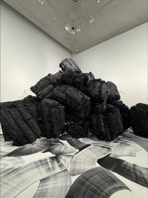 미술관 입구에 세운 8m 높이의 설치작 '불로부터'에 대해서 작가는 "재앙에 대한 두려움 속에서 우리가 할 수 있는 건 염원뿐"이라며 "치유와 회복을 바라는 마음으로 숯 7t을 쌓아 올렸다"고 말했다.