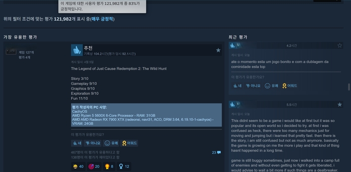 실제 글로벌 최대 PC게임 다운로드 플랫폼 스팀에서 붉은사막 이용자 평가는 초창기 긍정·부정 이슈가 절반으로 갈리는 ‘복합적’에서 83% 이상이 긍정적으로 평가한 ‘매우 긍정적’으로 올라갔다.