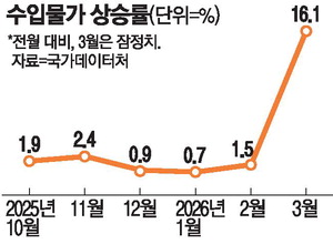이문희 한은 물가통계팀장은 "3월 유가와 환율이 올라 광산품,석탄·석유제품을 중심으로 수입물가가 크게 상승했다"고 설명했다. 지난 2월 시작된 중동 전쟁 영향으로 3월 중동산 두바이유 가격은 배럴당 128.52달러를 기록해 2월 68.40달러 대비 87.9% 올랐다. 달러당 원화값은 1486.64원으로,전달 대비 2.6% 하락했다.