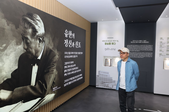 윤태호 작가가 서울 노량진 유한양행 본사 내 유일한기념관에서 유일한 박사의 사진을 바라보고 있다. 유한양행 제약사 유한양행의 창립자이자 청렴한 기업가의 대명사. 부의 대부분을 사회에 환원하며 ‘노블레스 오블리주’를 실천한 위인. 고(故) 유일한 박사 하면 떠오르는 이미지다. 최근 유 박사의 일대기를 담은 웹툰 ‘뉴(NEW) 일한’을 연재한 윤태호 작가(57) 역시 작품을 맡기 전까지는 크게 다르지 않았다.